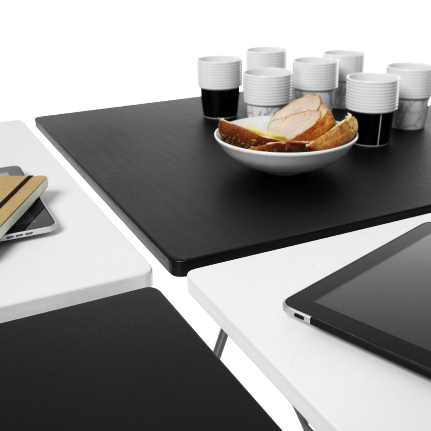 Som alla våra produkter, är även dessa tillverkade av högkvalitativa material. De finns med både rund eller fyrkantig bordsskiva i både vit eller svart färg, vilket gör att de passar alla olika användare och användningsområden. När de inte används kan de enkelt fällas ihop och förvaras på ett platsbesparande sätt.