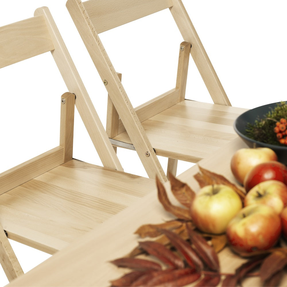 Klappstolen i trä har en utmärkt sittkomfort. Stolen är tillverkad av massiv bok och finns i både natur och svartbets. Den är stabil, testad och godkänd av SP, Sveriges Tekniska Forskningsinstitut enligt EN 16139:2013, nivå 1.
